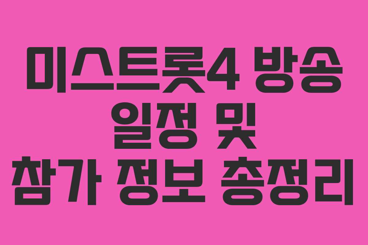 2025년 하반기, TV조선의 인기 오디션 프로그램 ‘미스트롯4’가 방송될 예정입니다. 이번 시즌은 참가자 모집을 이미 시작했으며, 방송은 12월 중순부터 예정되어 있습니다. 이 글에서는 미스트롯4의 개요와 방송 일정, 예선 접수 방법, 시청 팁 등을 상세히 정리해드리겠습니다.