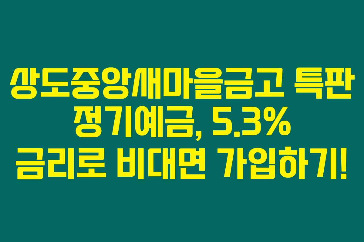 상도중앙새마을금고에서는 현재 5.3%의 고금리로 특판 정기예금을 판매하고 있습니다. 이 상품은 가입조건이 없어 누구나 쉽게 접근할 수 있어요. 그럼 본격적으로 이 상품의 가입 방법과 혜택을 알아보도록 할게요.