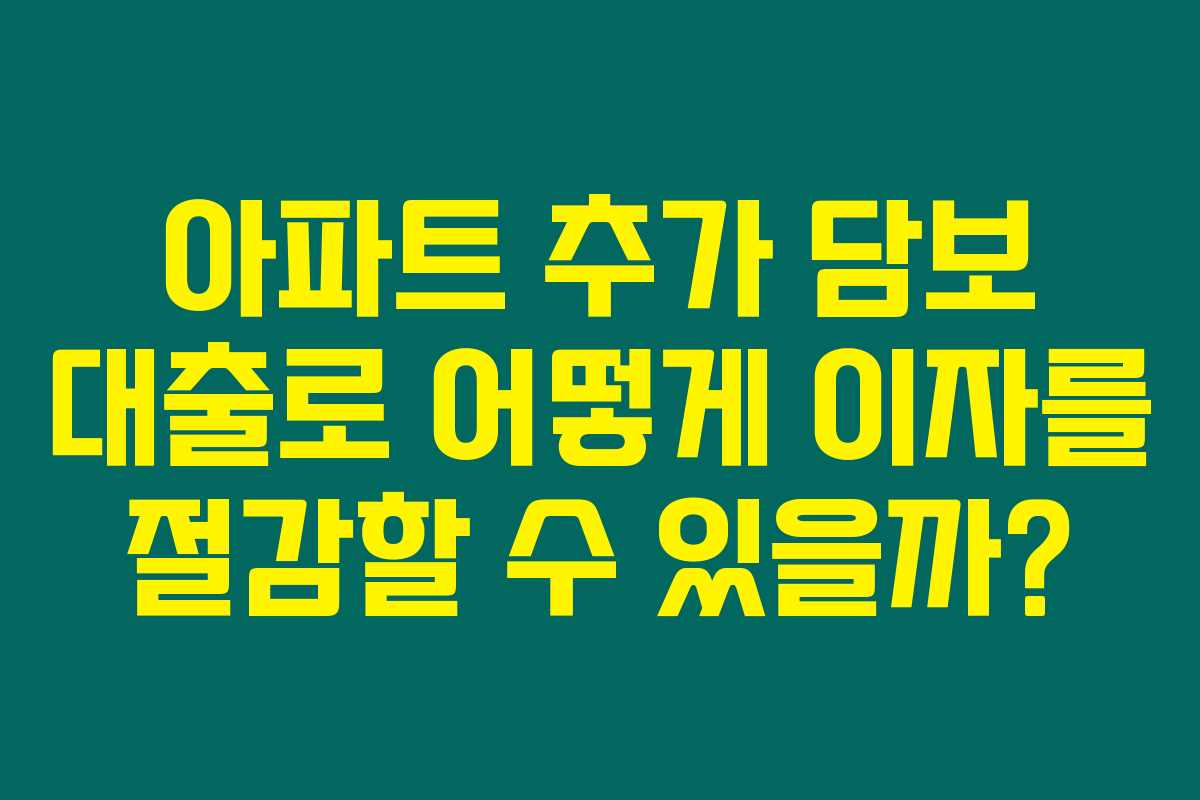 아파트 추가 담보 대출을 통해 더 낮은 금리로 기존 대출을 대환하여 이자를 절감할 수 있으며, 필요한 경우 추가 자금도 마련할 수 있습니다.