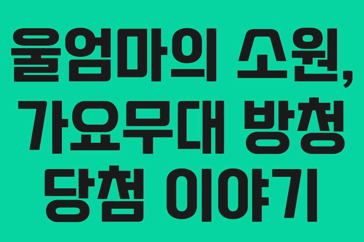 가요무대 방청에 당첨된 기쁜 소식을 전해드립니다. 울엄마의 오랜 소원이 이루어졌습니다! 매주 월요일마다 방영되는 가요무대는 엄마가 사랑하는 프로그램 중 하나로, 그녀는 항상 “죽기 전에 꼭 한 번 가고 싶다”는 말씀을 하셨습니다. 이번 기회를 통해 엄마의 소원을 이뤄주게 되어 정말 기쁩니다.