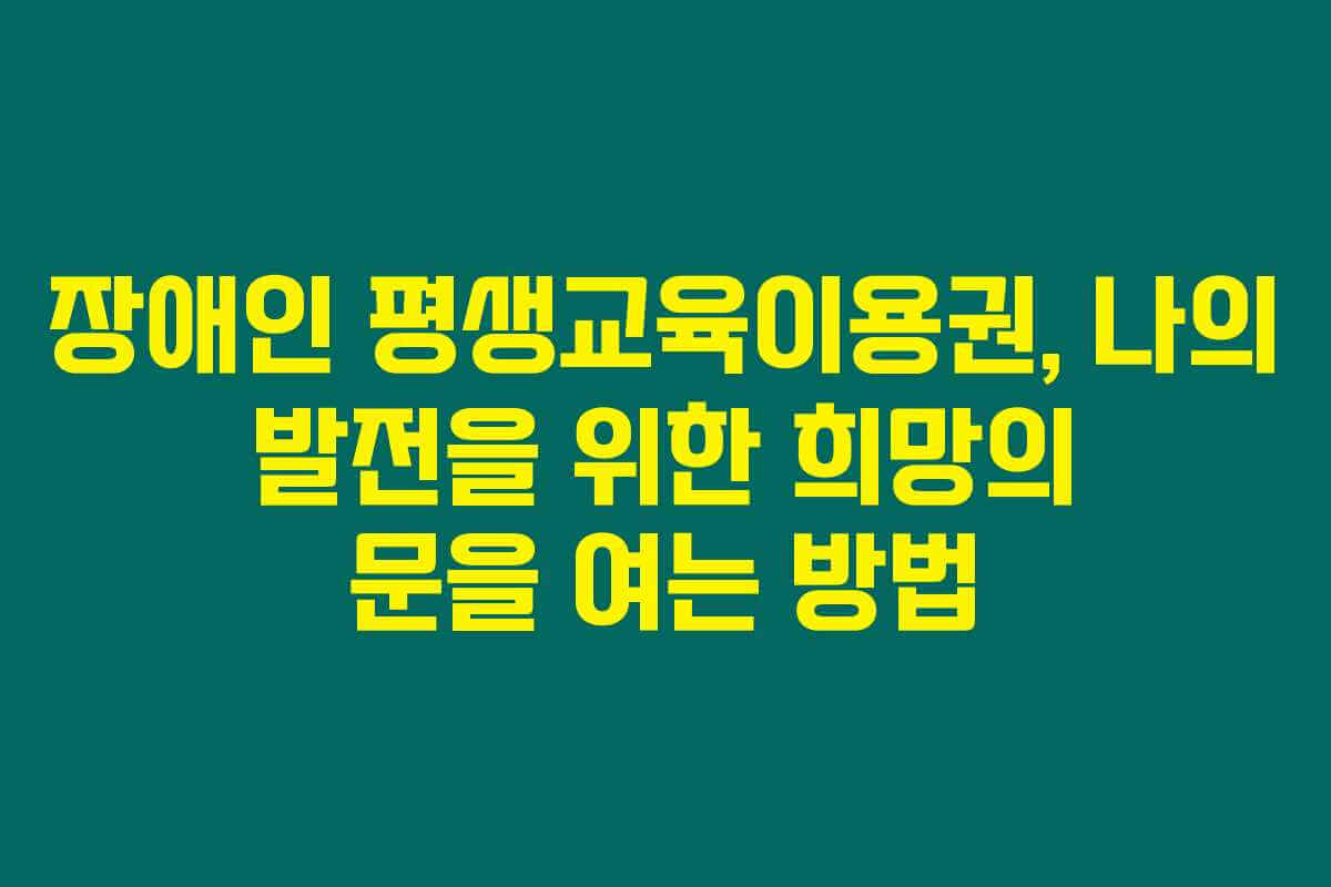 장애인 평생교육이용권은 장애인들이 다양한 교육 프로그램을 통해 자신의 능력을 키우고 사회적으로 활동할 수 있도록 지원하는 제도입니다. 제가 직접 리서치한 바로는, 이 제도를 통해 많은 장애인들이 평생학습의 기회를 가질 수 있게 되었고, 결과적으로 자기 발전을 이룰 수 있는 발판이 되고 있습니다.